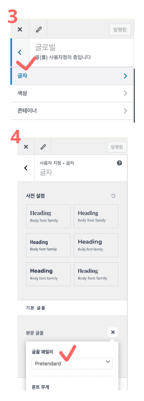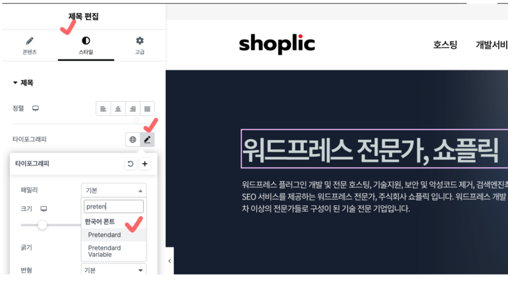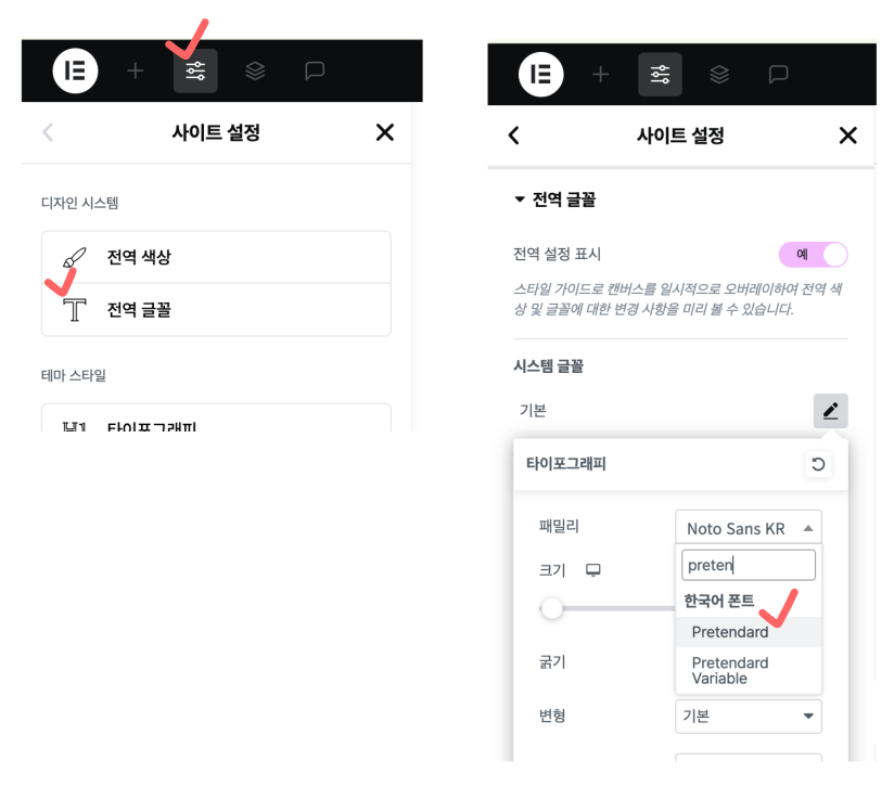 플러그인 설치후 각 빌더의 글꼴 설정 페이지로 들어갑니다.