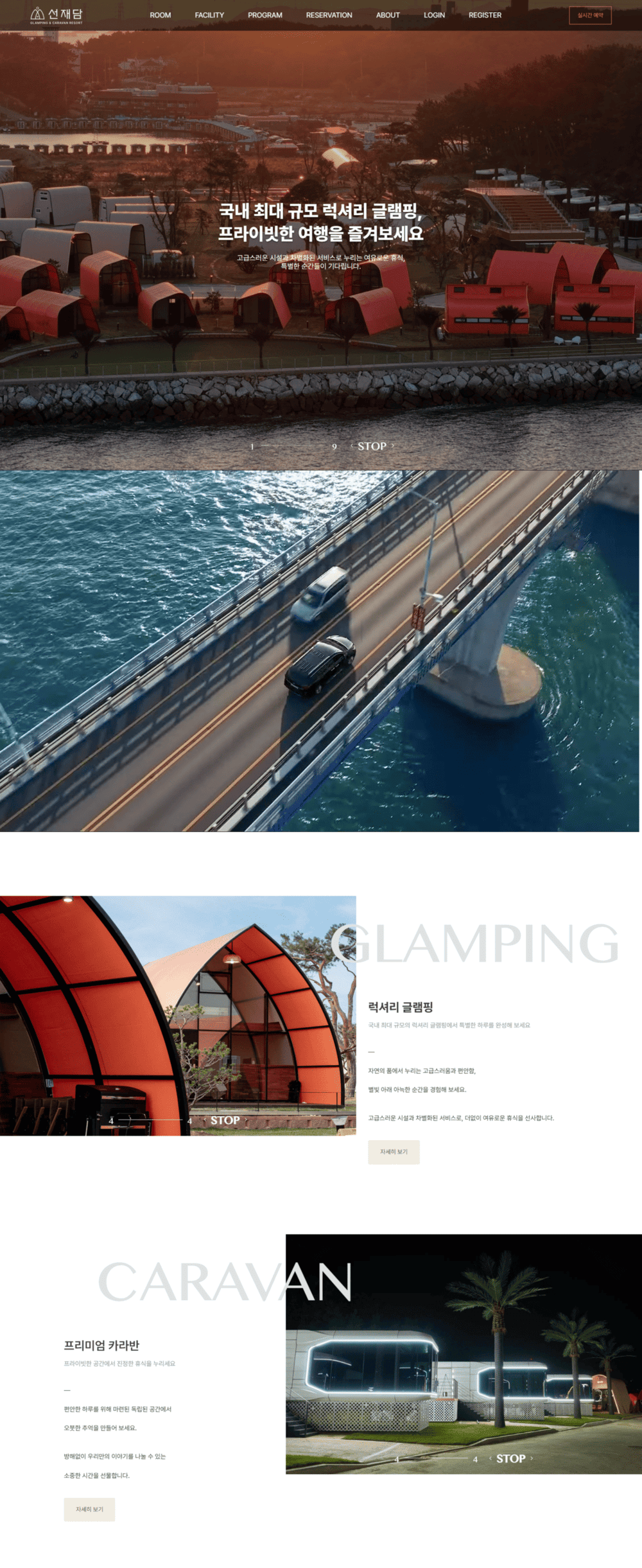 국내 최대 규모 럭셔리 글램핑장 선재담 글램핑&카라반 리조트 홈페이지 및 예약시스템을 개발하였습니다.